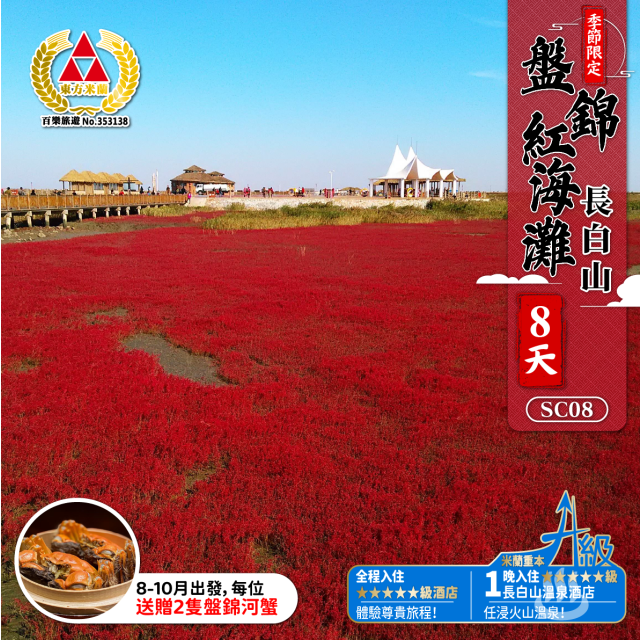 季節限定8-10月 盤錦紅海灘 長白山 8天深度之旅 團號:SC08