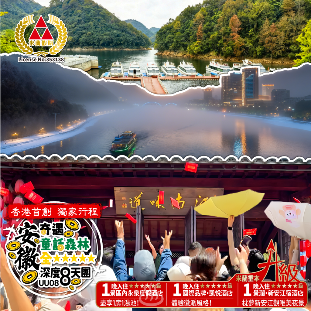 最TOP享受 全程入住五星級酒店,保證入住1晚永泉小鎮內度假溫泉酒店•盡享1房1湯池、1晚國際品牌五星徽派風格凱悅酒店+1晚國際品牌五星景濶酒店•枕夢新安江!